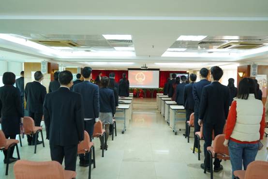 公司升國(guó)旗儀式現(xiàn)場(chǎng),全體參會(huì)員工起立奏唱國(guó)歌