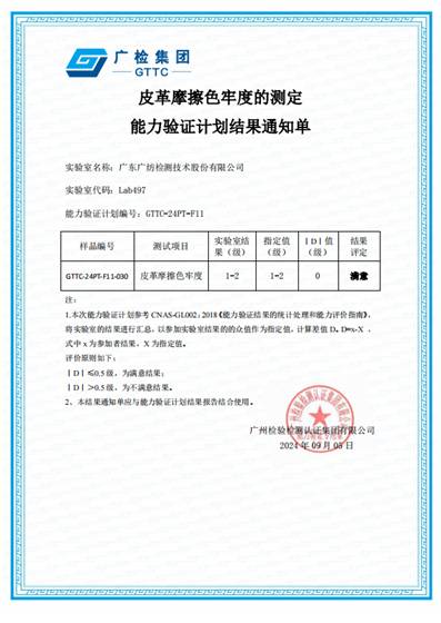 喜報:廣紡檢測公司收到皮革摩擦色牢度的測定能力驗證結(jié)果滿意通知單
